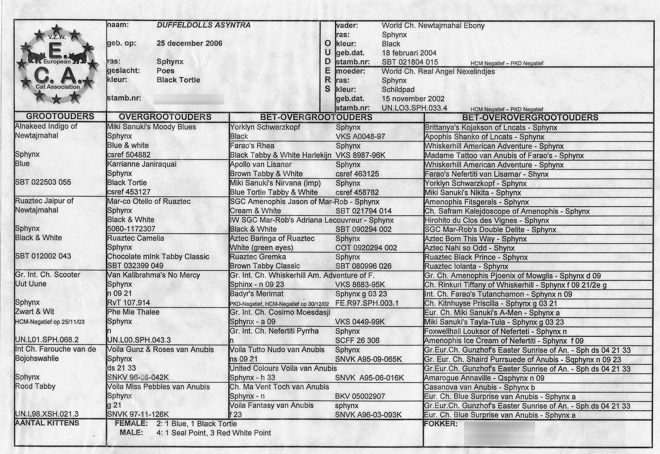 Vraag bij de fokker die kittens aanbiedt de stamboom op van de ouders + hun testen…… stambomen kunnen er heel divers uitzien, maar op elk stamboom kan je de namen terug vinden tot (minstens) 5 generaties ver.