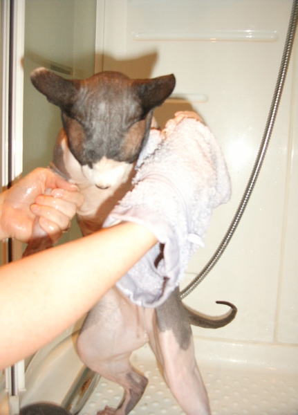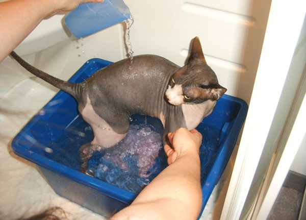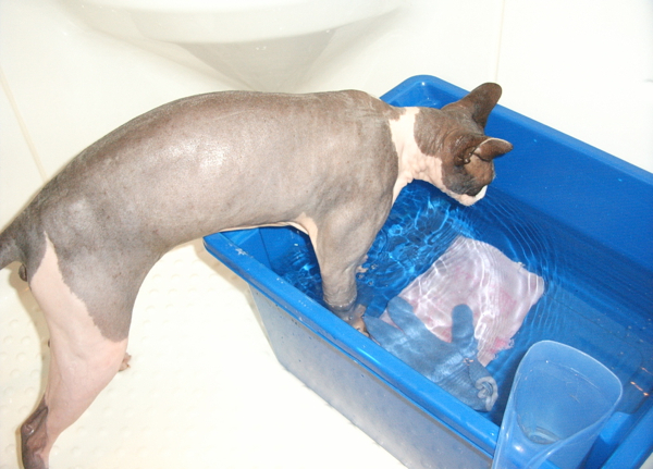 We gebruiken iets warmer water dan de gekende babytemperatuur omdat we gaandeweg gemerkt hebben dat onze sphynxen veel rustiger zijn in warm water, dan gaan ze ook echt zitten genieten van de warmte.
