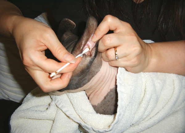 Ook moet men extra aandacht besteden aan het oorsmeer dat ook in een grotere hoeveelheid geproduceerd wordt dan bij normaal behaarde katten. Het is belangrijk dit overtollige oorsmeer weg te halen teneinde het oor van een goede ventilatie te voorzien, anders wordt ook dit lichaamsdeel een broeihaard voor bacterieën, gisten en mijten wat op termijn kan resulteren in oorontstekingen.